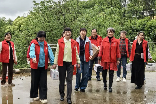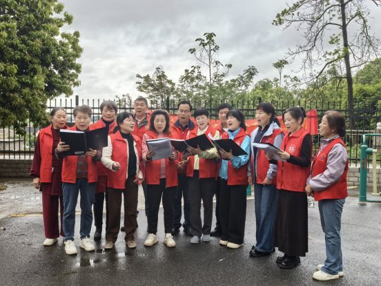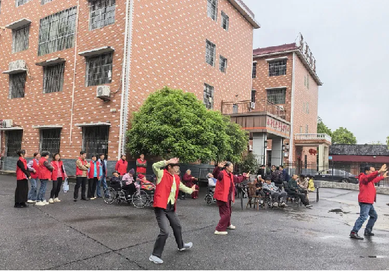 雨停的时候,大家把老人们带到中心侧边的小广场,一边感受雨后清新空气,一边欣赏老党员们精心准备的文艺表演。